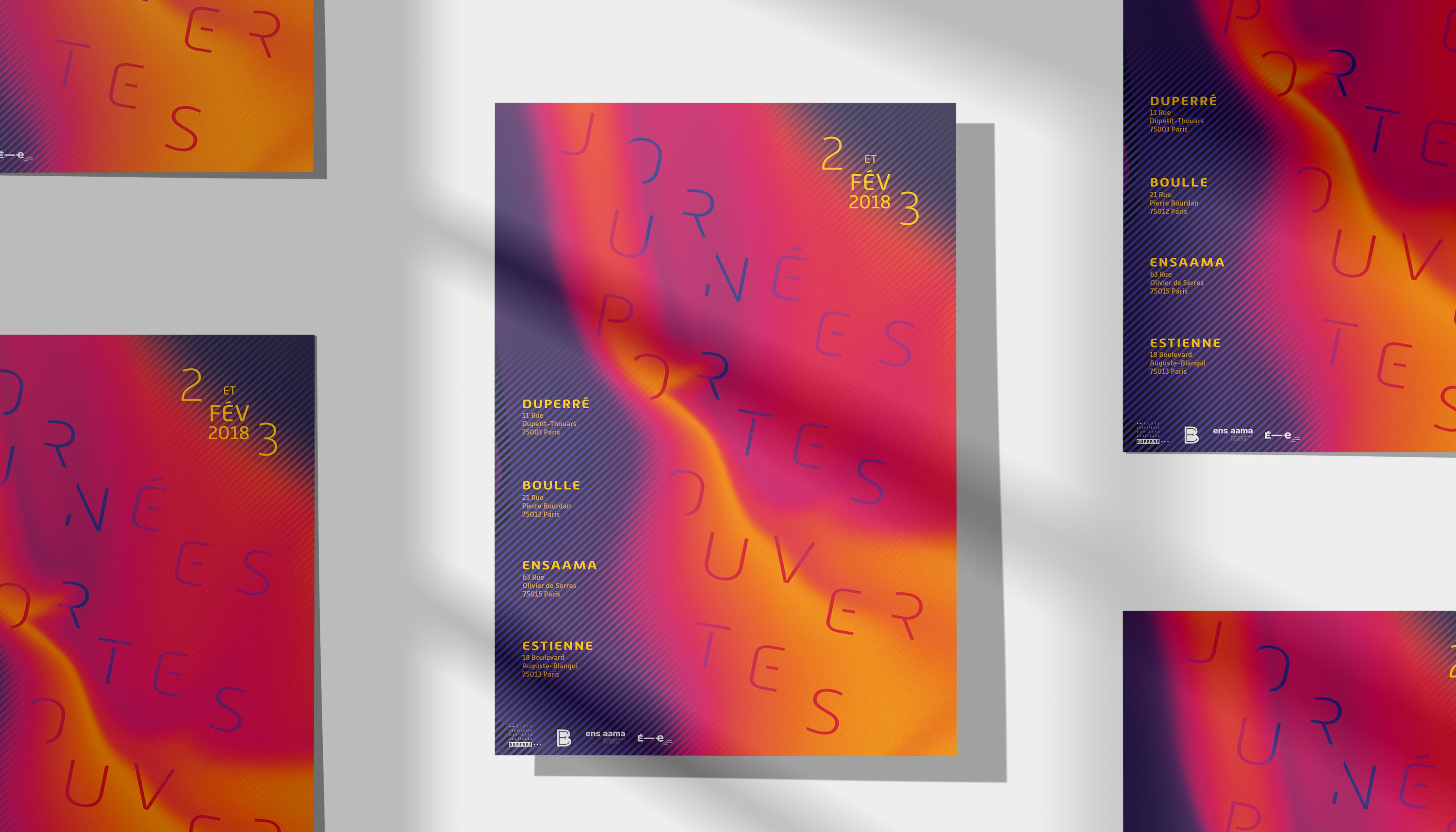 Design of a poster for the open days of the four parisian schools of applied arts. Find a common abstract form, evoking the creativity of the students, creating an attractive visual for a target between 17 and 25 years old.