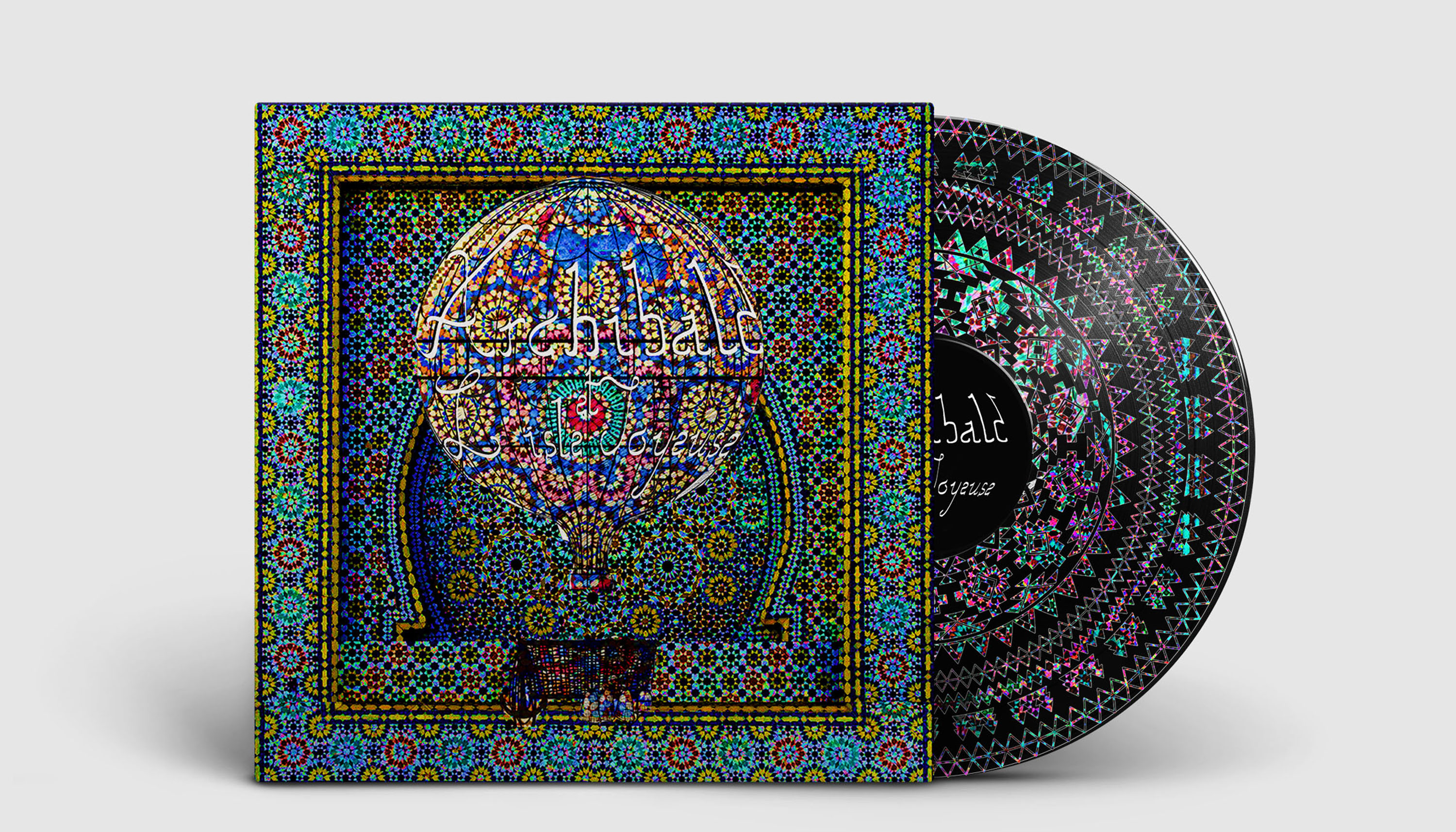 Cover and a booklet illustration, for the recording of the play Archibald and L'Isle Joyeuse. Use the idea of travel, through imaginary machines and oriental mosaics.