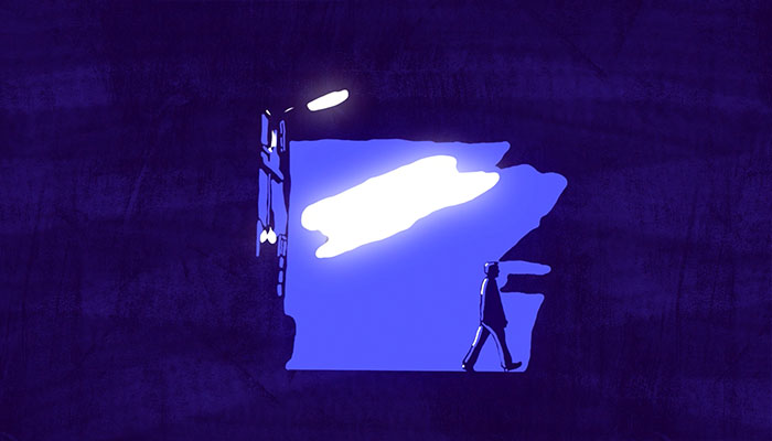 Find a way to illustrate the lights of the night, taking into account its peculiarities, as opposed to those of the day, and thus its atmospheres, its parts of shadows and mysteries. Tell the story that can be joined to characters that we only see partially, from the girl lighting her cigarette, to the infatuated dancers, and to the noisy bar signs.
