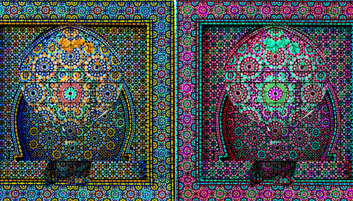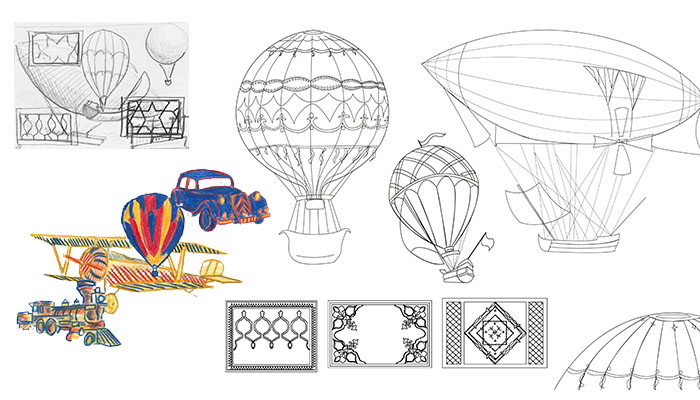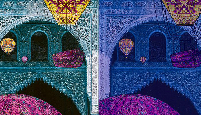 Use the idea of travel evoked through the character’s genius in the play, through imaginary machines and oriental mosaics, playing on the levels of readability of the text. The text is printed on blue layers in order to facilitate readability, and not to lose the strength of the colors of the image.